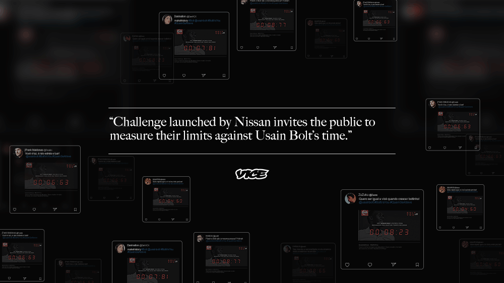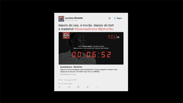 ⇁ Nissan was the official sponsor of Usain Bolt and, to support him at the Rio 2016 Olympic Games, we invited the fastest minds on the internet to challenge the world’s fastest man’s record. Before the finals of the 100-meter dash, we encouraged people on twitter to send a message to Bolt, but with one condition: they had only 9,58 seconds to do it.